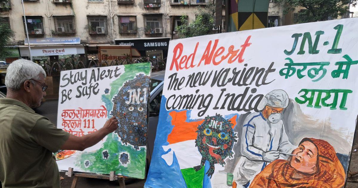 IMAGE: An artist An artist from the Gurukul School of Art makes a painting to spread awareness on taking precaution after the recent detection of Covid subvariant JN.1 in Kerala. Photograph: Sahil Salvi for Rediff.com