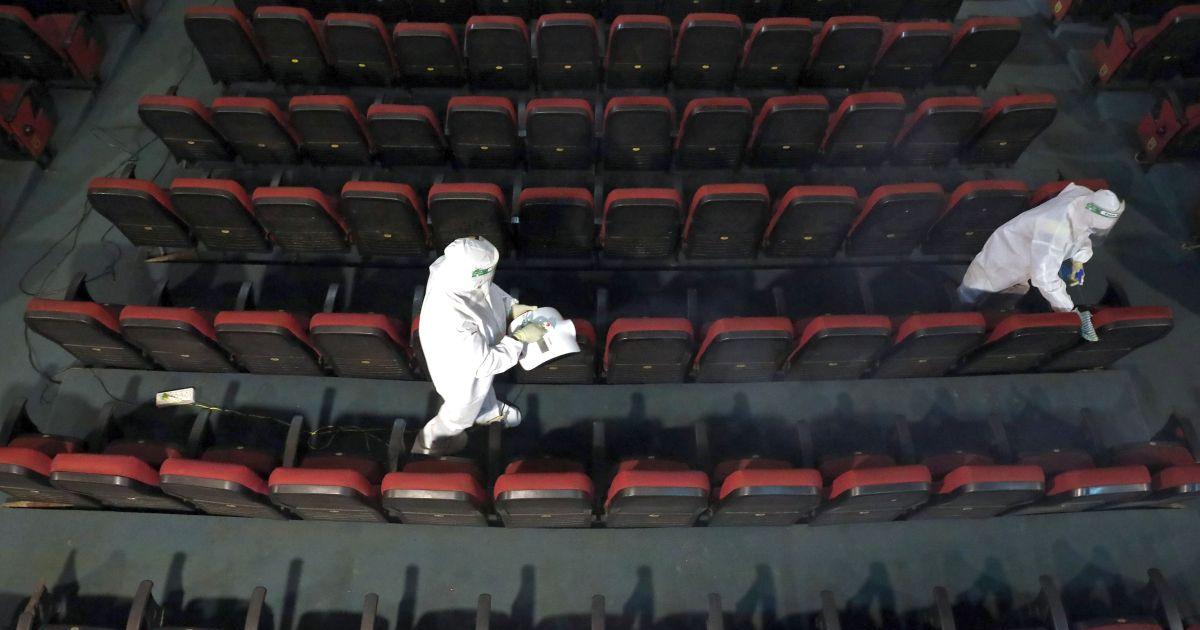 IMAGE: Workers wearing personal protective equipment sanitise and clean the seats of Star theatre ahead of its reopening, amidst the outbreak of the coronavirus disease , in Kolkata. Photograph: Rupak De Chowdhuri/Reuters