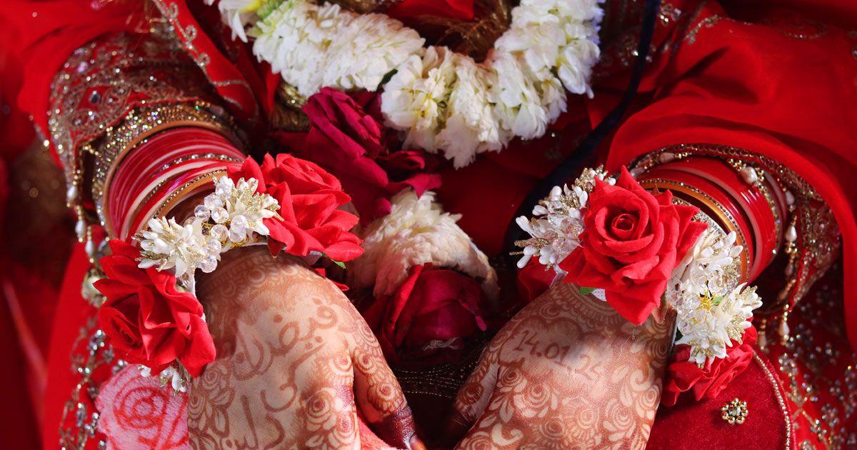 IMAGE: A woman carrying a garland walks past the brides.