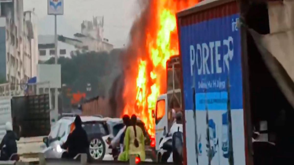 Traffic on the Bengaluru-Mumbai carriageway of the highway was stopped and the work of removing the gutted vehicles was underway.