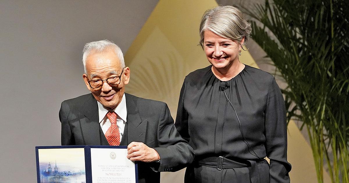 IMAGE: Nobel Prize Physics Laureate Syukuro Manabe, who is 90, poses with his award during a ceremony at the National Academy of Sciences in Washington DC, December 6, 2021, as Swedish Ambassador to the US Karin Olofsdotter looks on.