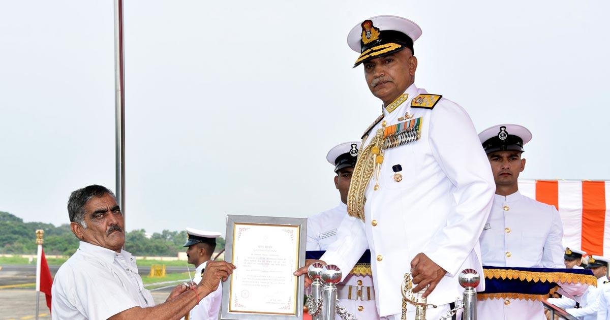 IMAGE: Admiral Hari Kumar presents the Sarvottam Jeevan Raksha Padak (posthumous) to Devaram Godara, Sailor Ramavtar Godara's father. Photograph: PRO Defence Kochi Twitter/ANI Photo