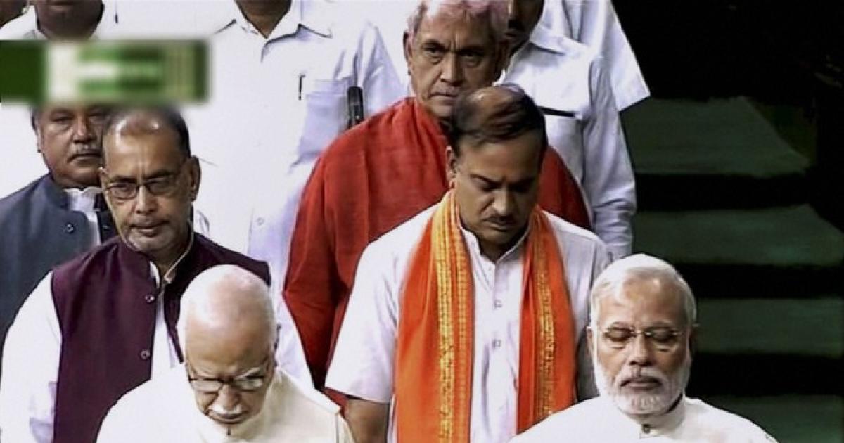 Image: A videograb showing PM Modi and LK Advani mourning the death of Gopinath Munde in Parliament on Wednesday