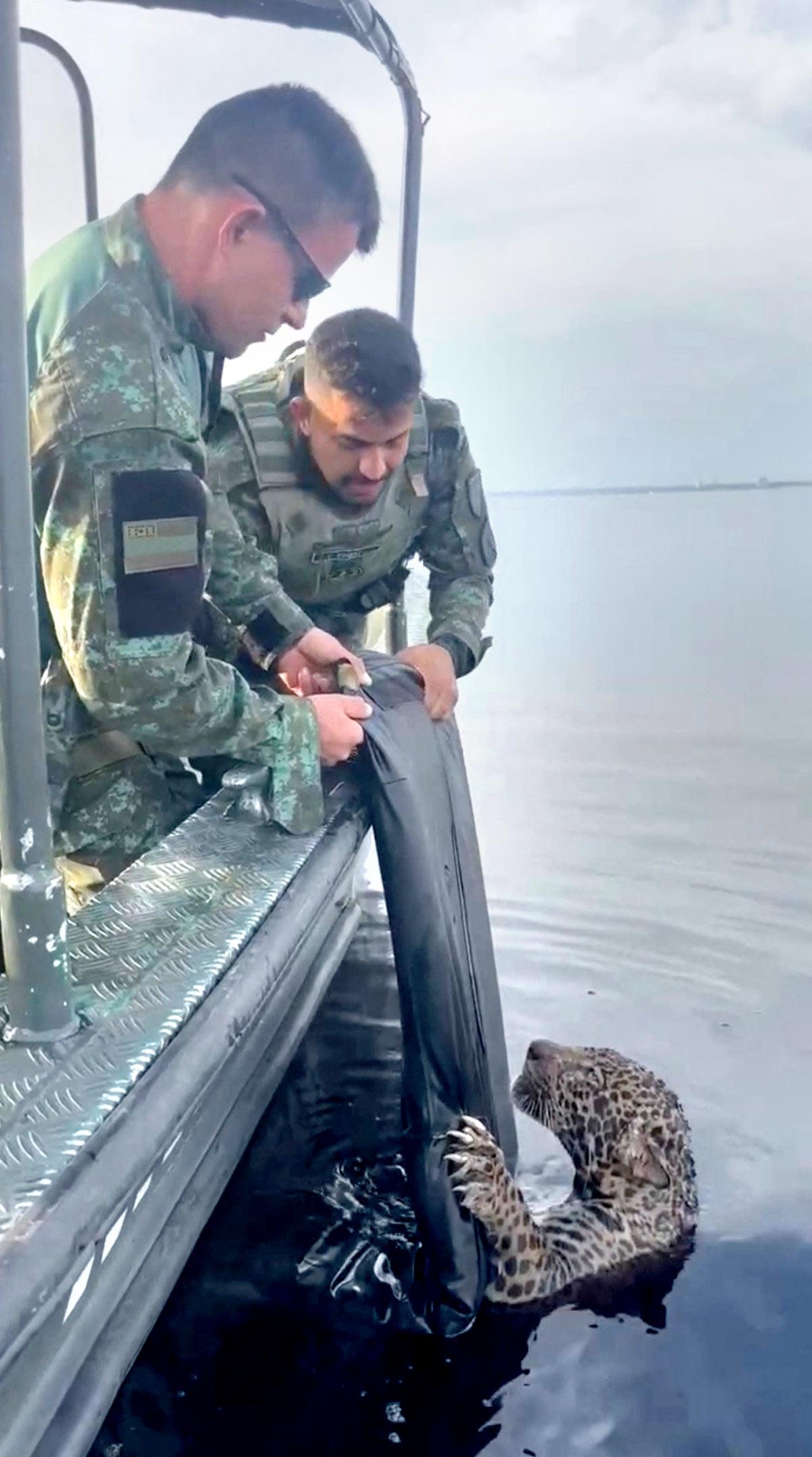 IMAGE: A jaguar with gunshot wounds is rescued by members of the military police from the Rio Negro in Manaus, Brazil in this screen grab taken from a video. Photograph: Secretaria de Estado de Seguranca Publica do Amazonas/Handout via Reuters