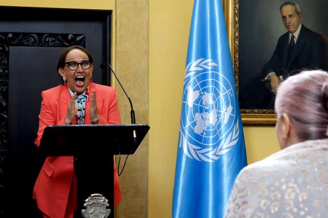 IMAGE: Rebeca Grynspan, Costa Rica's former vice president, reacts at a news conference in San Jose, where the government announced her nomination for United Nations secretary-general. Photograph: Mayela Lopez/Reuters
