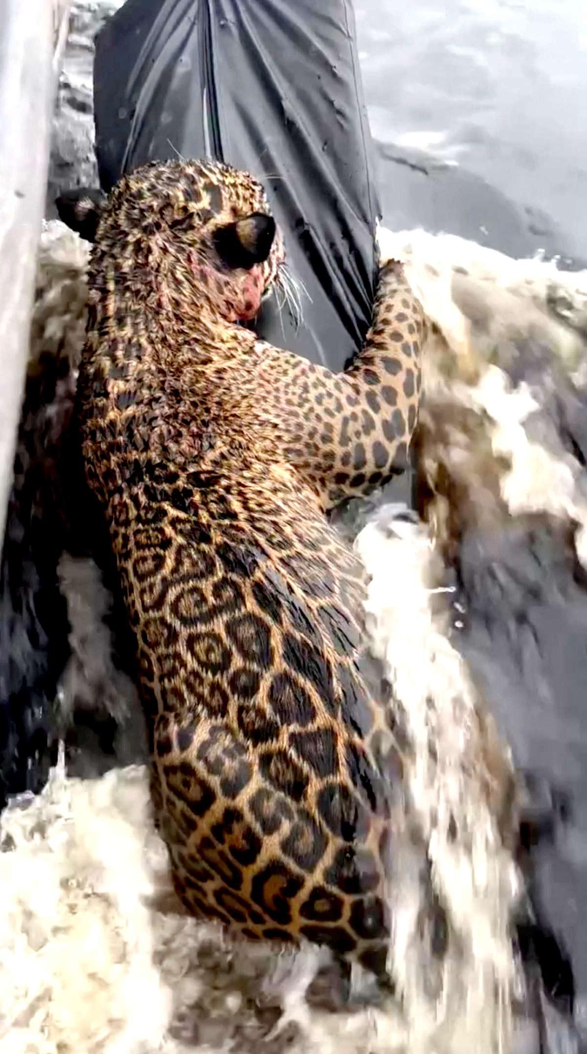 IMAGE: A jaguar with gunshot wounds is rescued by members of the military police from the Rio Negro in Manaus, Brazil in this screen grab taken from a video. Photograph: Secretaria de Estado de Seguranca Publica do Amazonas/Handout via Reuters