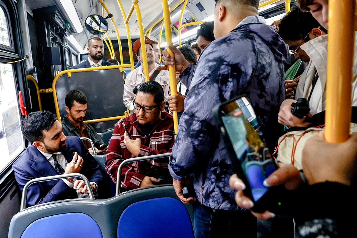 IMAGE: New York City mayoral candidate Zohran Mamdani, seated left, rides the M57 bus on his way to a press conference about his proposal for free and fast buses in New York City. Photograph: Kylie Cooper/Reuters