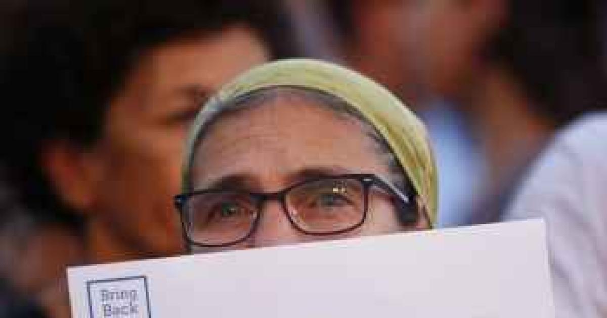 Image: An Israeli woman holds a sign with images of three missing Israeli teenagers, at a rally in Tel Aviv