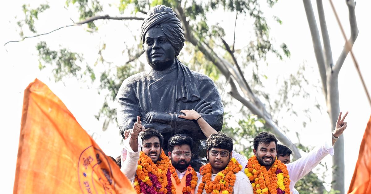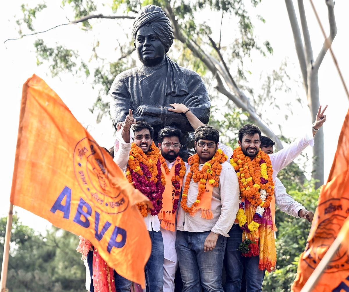 After the results were announced, ABVP's winning candidates were lifted on the shoulders by their supporters, who raised slogans hailing them.