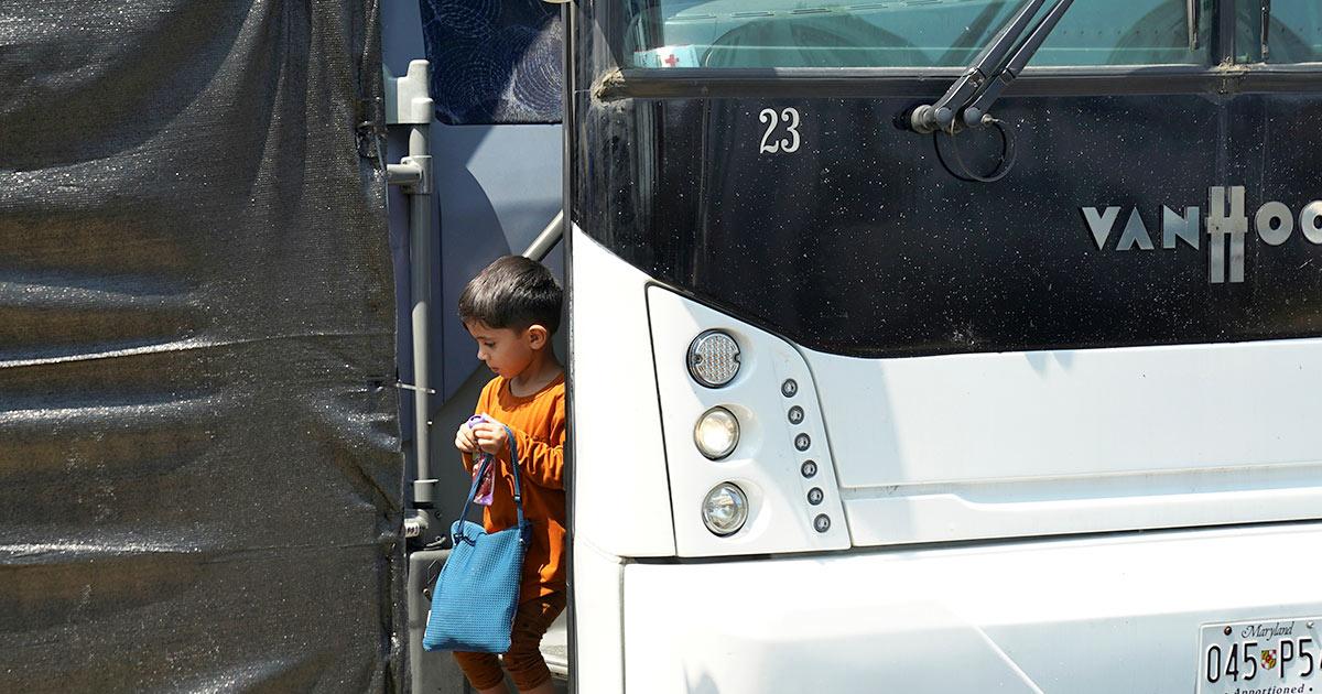 IMAGE: A little Afghan boy steps out of a bus on arrival at the processing centre for refugees evacuated from Afghanistan at the Dulles Expo Center near Dulles international airport in Chantilly, Virginia, USA, August 24, 2021. Photograph: Kevin Lamarque/Reuters