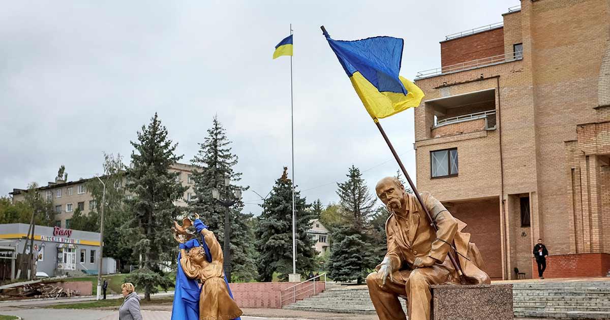 IMAGE: A Ukrainian flag installed on the monument to Ukrainian poet Taras Shevchenko is seen in the town of Balakliia. Photograph: Gleb Garanich/Reuters