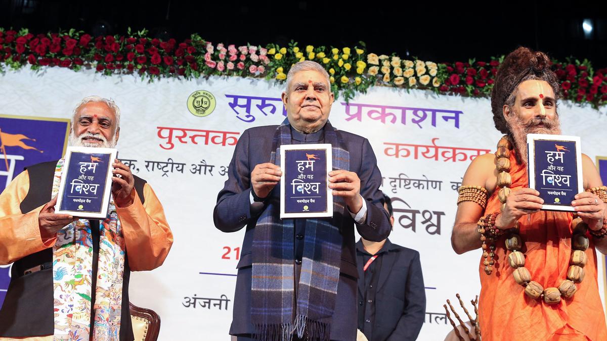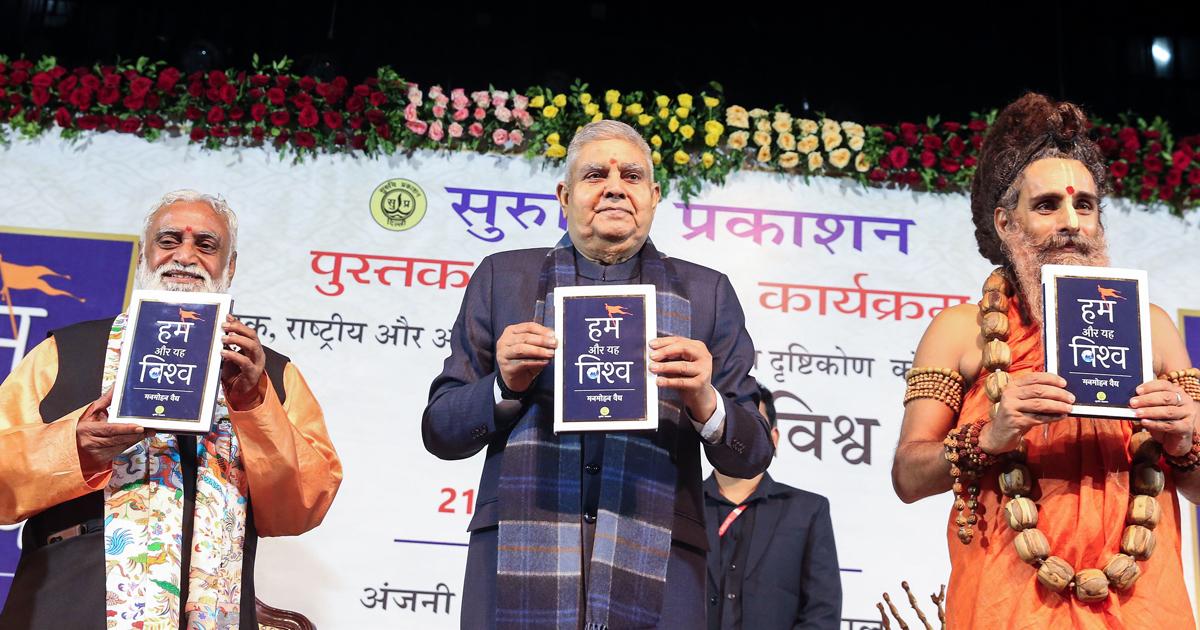 IMAGE: Former Vice President Jagdeep Dhankar (middle), spiritual leader Peethadhishwar, Anandam Dham Ashram, Vrindavan-Mathura, Riteshwar Maharaj, during a book release 'Hum Aur Yeh Vishwa' written by senior RSS pracharak Dr Manmohan Vaidya, at Ravindra Bhawan in Bhopal, November 21, 2025. Photograph: ANI Photo