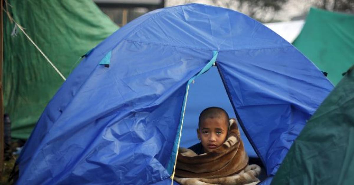 Image: A boy sits inside a tent on an open ground, after Saturday’s earthquake in Kathmandu, Nepal. Photograph: Adnan Abidi/Reuters