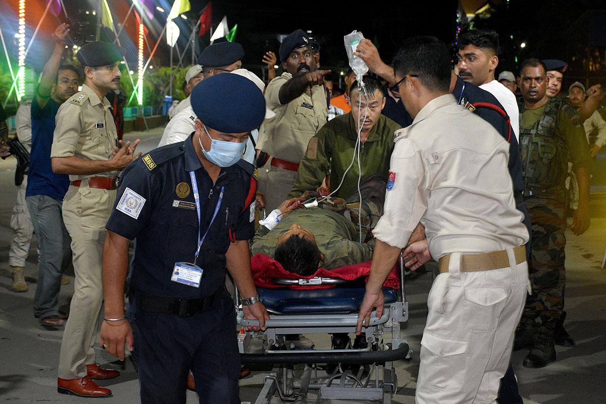 IMAGE: A paramilitary trooper from Assam Rifles is rushed to the Regional Institute of Medical Sciences hospital for treatment after he was injured in the terror attack. Photograph: Reuters/ANI Photo