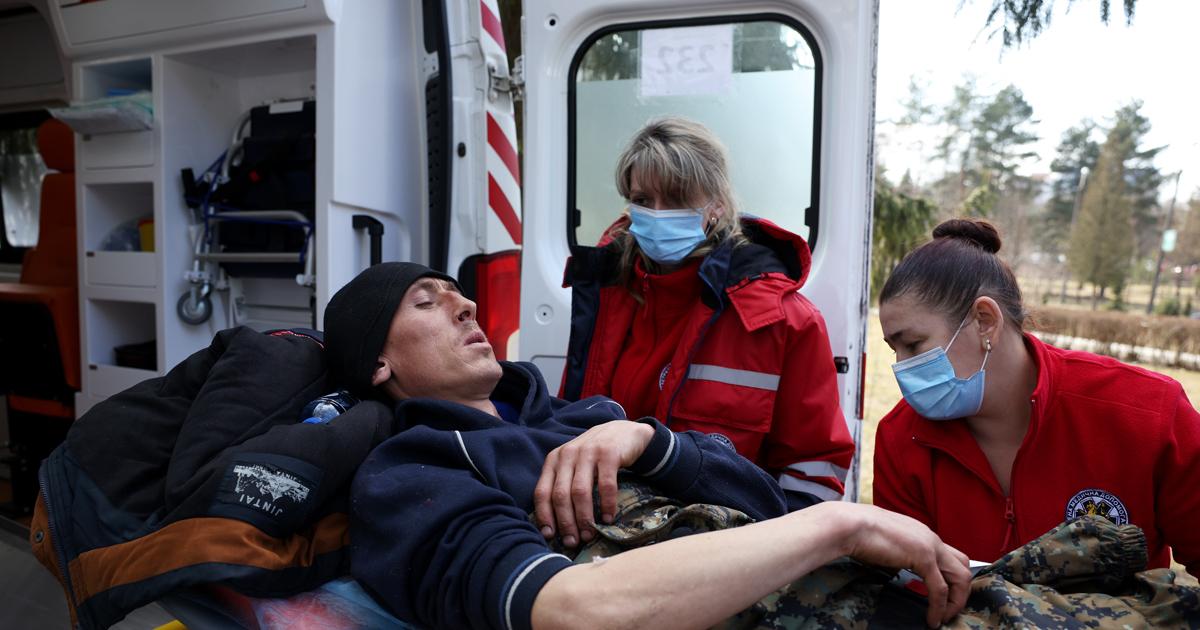 IMAGE: An injured soldier is transported by medical workers at the hospital in Novoyavorivsk.