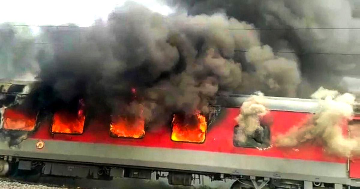 IMAGE: The Farakka Express on fire at Danapur station. Photograph: ANI Photo