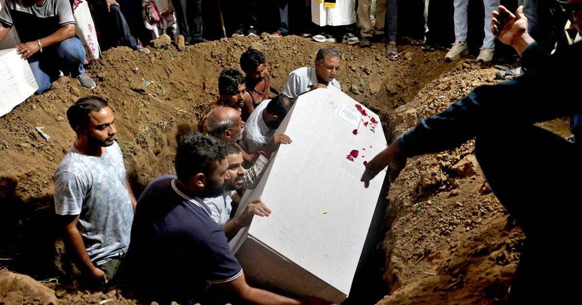 IMAGE: Relatives of her husband Rozar David Christian lower the coffin containing his remains during burial. Photograph: Amit Dave/Reuters