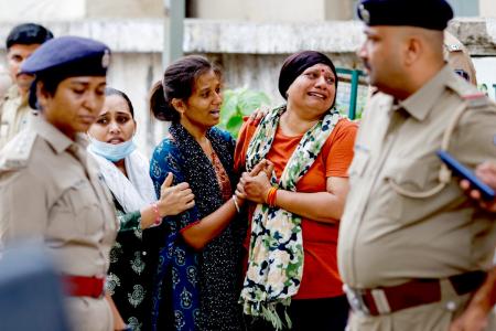 IMAGE: Relatives of victimsmourn as they wait outside the postmortem room at a hospital in Ahmedabad. Photograph: Adnan Abidi/Reuters