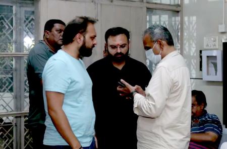 IMAGE: Family members of former Gujarat CM Vijay Rupani who lost his life in the AI-171 plane crash, at the Civil Hospital, Asarwa, Ahmedabad. Photograph: ANI Photo