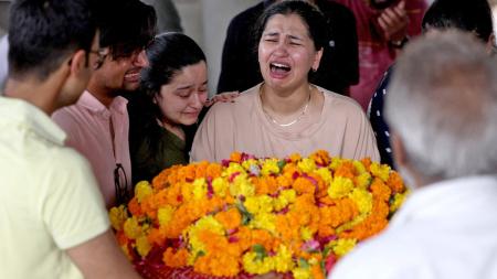 IMAGE: Relatives of Shubh Modi, who lost his life in the Air India crash, at his funeral at a crematorium in Ahmedabad, June 15, 2025. Photograph: Amit Dave/Reuters