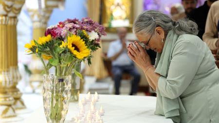 IMAGE: A woman prays during a vigil at the Vishwa Hindu Mandir in Southall, London, June 15, 2025 in memory of those who lost their lives in the Air India plane crash. Photograph: Isabel Infantes/Reuters