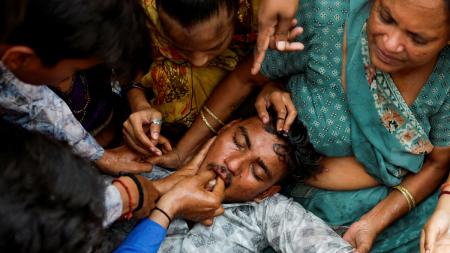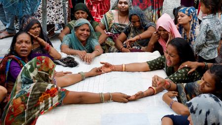 IMAGE: Kalpeshbhai Patni, 28, fainted while mourning his younger brother Akash Patni, 14, who died after debris from the Air India Dreamliner plane struck him, as relatives wait for Akash's body to arrive at his house for the last rites in Ahmedabad, June 15, 2025. Photograph: Adnan Abidi/Reuters