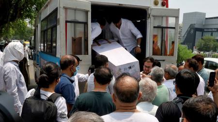 IMAGE: People unload the coffin containing the remains of Megha Mehta, who lost her life in the Air India crash, for her cremation in Ahmedabad, June 15, 2025. Photograph: Reuters