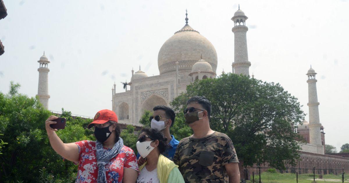 IMAGE: Tourists take selfie outside Taj Mahal in Agra. Photograph: Yatish Lavania/ANI Photo