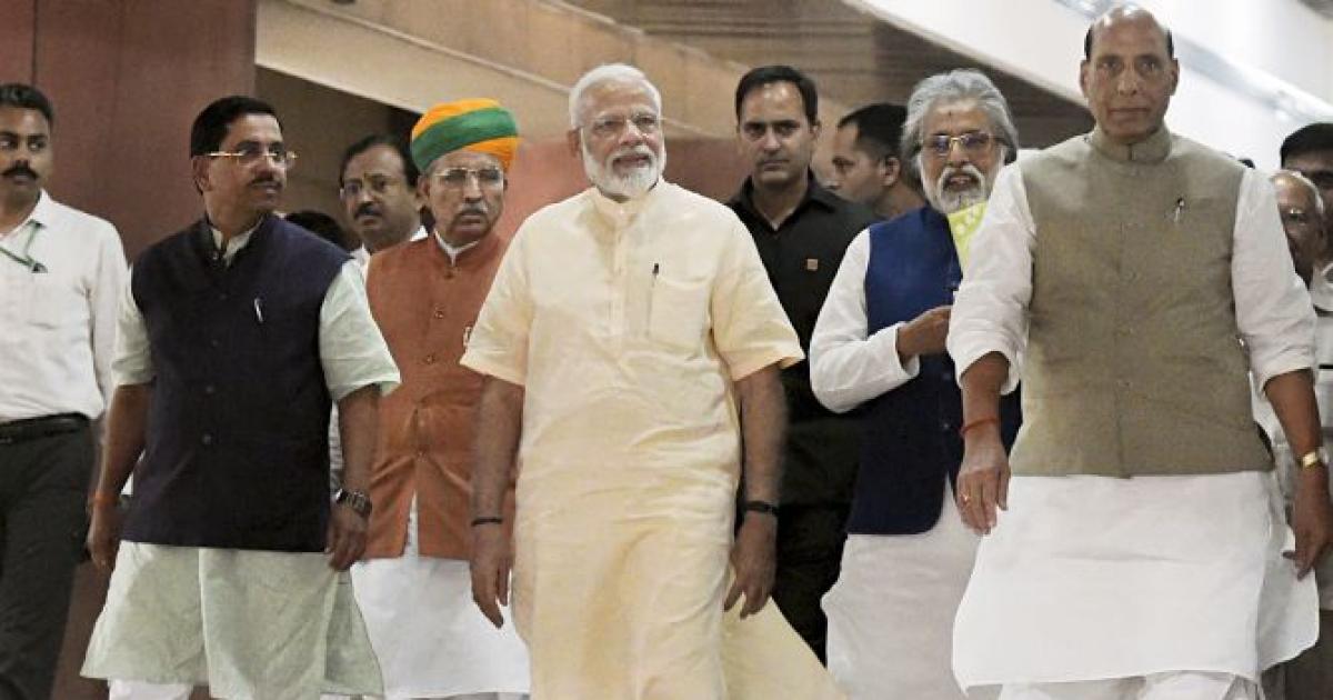 IMAGE: Prime Minister Narendra Modi along with other party leaders leave after attending an all-party meeting at Parliament House ahead of the 17th Lok Sabha session, in New Delhi, on Sunday. Photograph: Vijay Verma/PTI Photo