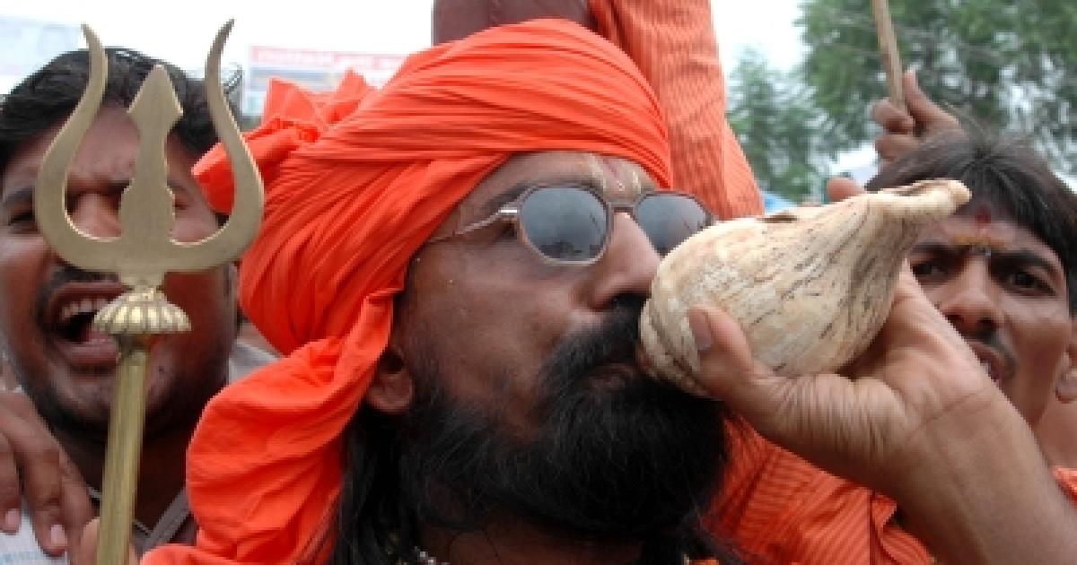 Image: A sadhublows into a conch shell during a protest in Allahabad