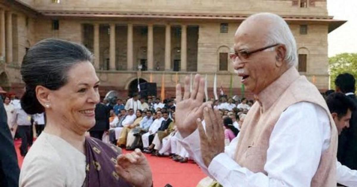 Image: Congress President Sonia Gandhi and L K Advani share a light moment during Narendra Modi's swearing-in. Photograph: PTI