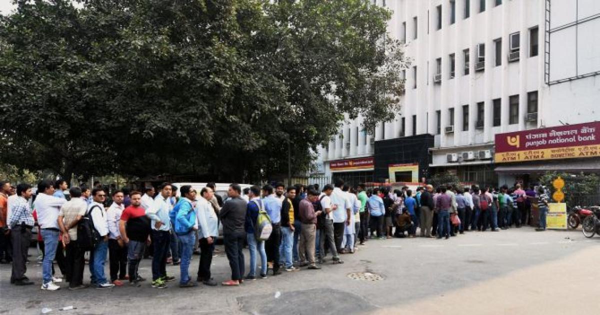 IMAGE: People queue up outside at ATM to withdraw money in New Delhi on Monday. Photograph: Subhav Shukla/PTI Photo