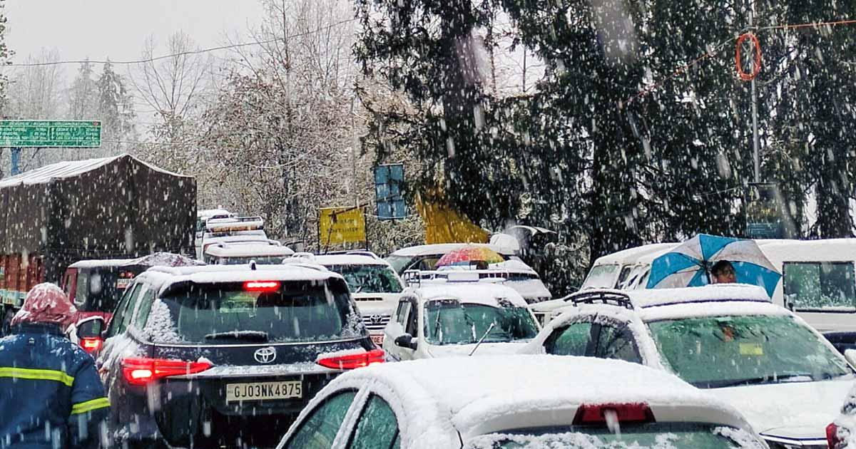 Glimpses of vehicles stuck in a traffic jam during fresh snowfall at Solang in Manali, Himachal Pradesh, on Monday, April 29, 2024.