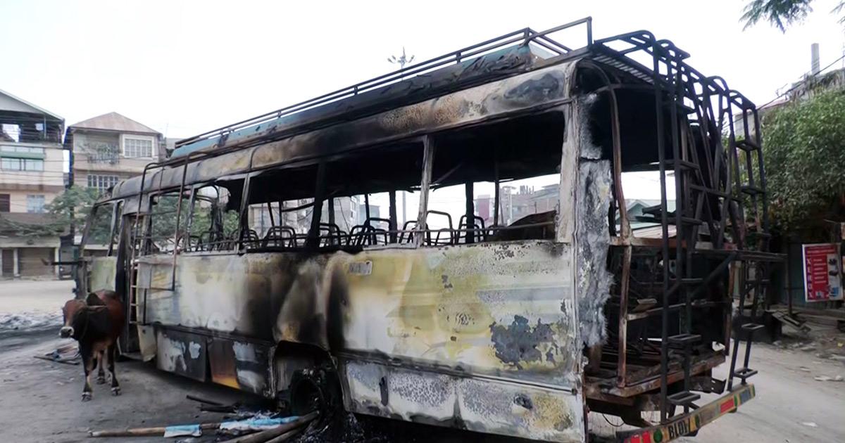 IMAGE: Charred remains of a bus in the Imphal Valley on Sunday after violence erupted in five districts of the Imphal valley to protest Kanan Singh's arrest.