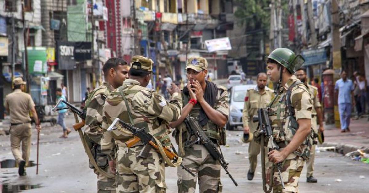 IMAGE: Army personnel stand guard during restrictions, in Jammu. Photograph: PTI Photo