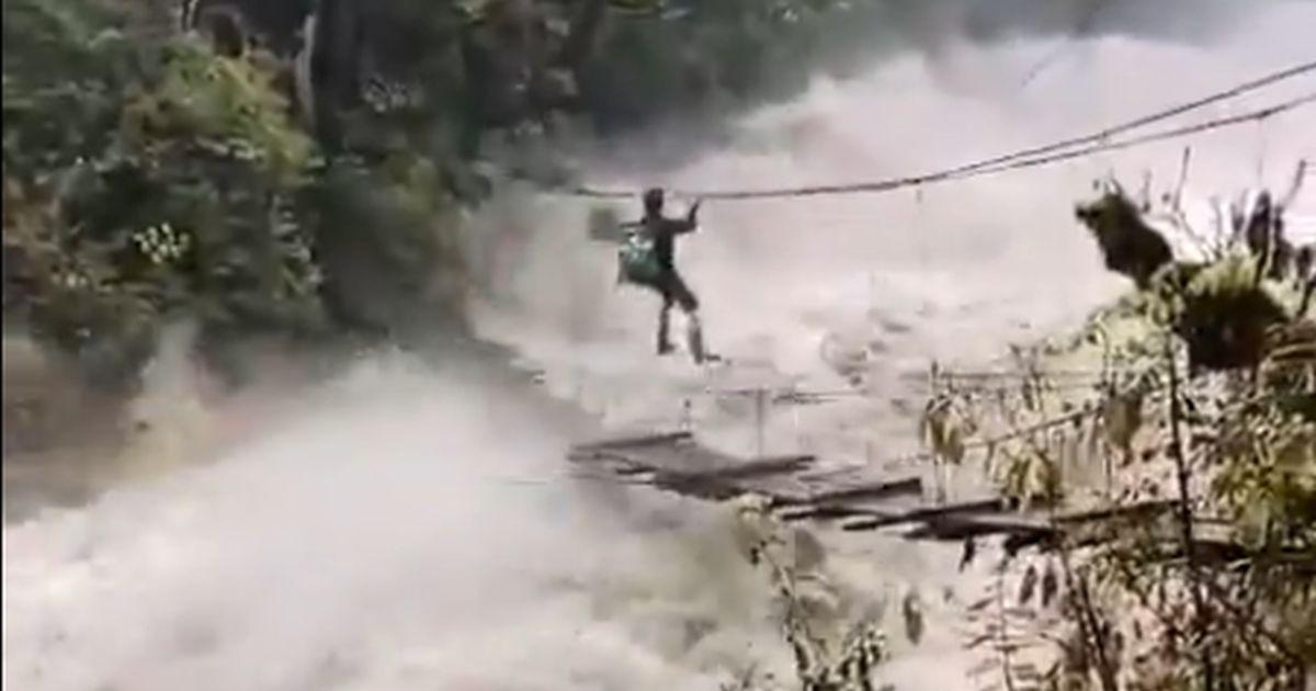 The video shows the man making his way across a swaying rope bridge in Arunachal's Anjaw district as gushing water thundered beneath him.