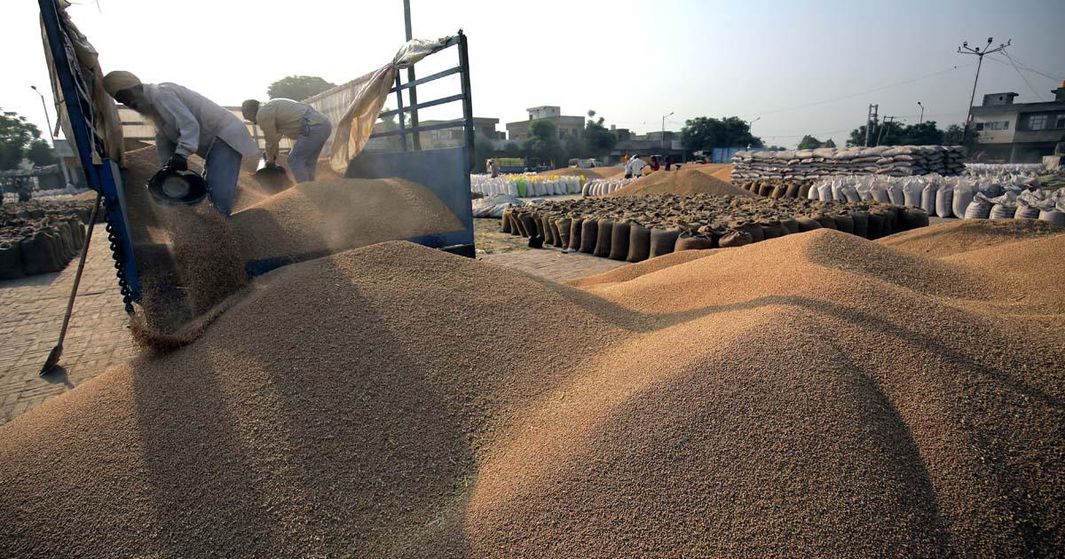 IMAGE: Labourers unload wheat grains from a trolley at the grain market, in Amritsar, Punjab. Photograph: ANI Photo