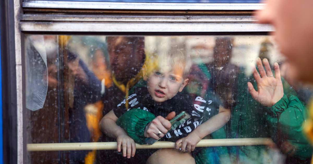 IMAGE: A woman and her son look out from an evacuation train from Kyiv to Lviv at the Kyiv central train station.