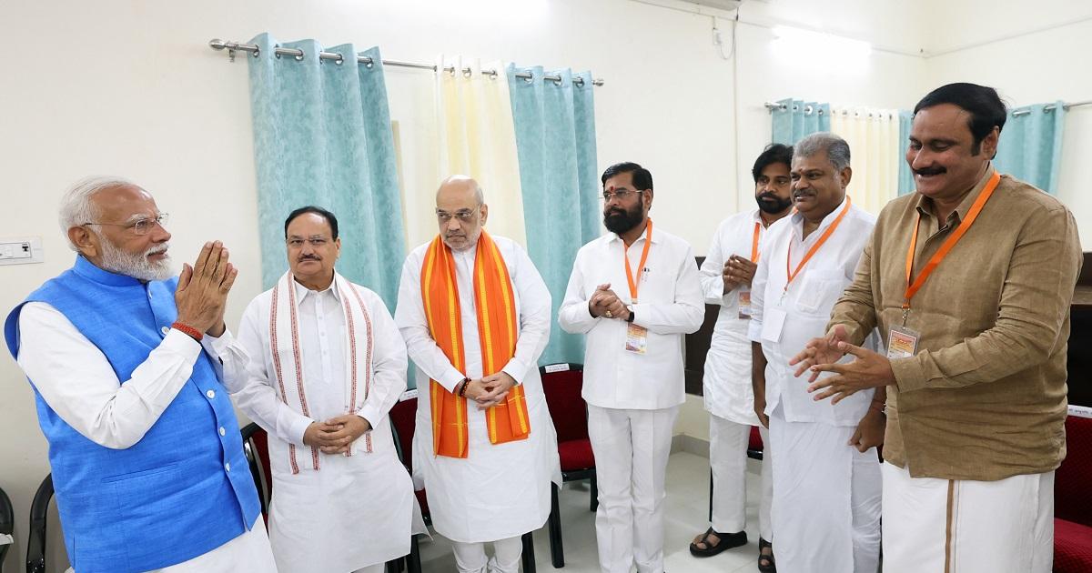 IMAGE: Prime Minister Narendra Modi meets with NDA leaders during his nomination filing for the Lok Sabha elections, in Varanasi, May 14, 2024. Union Home Minister Amit Shah, BJP national president JP Nadda and others are also seen. Photograph: ANI Photo