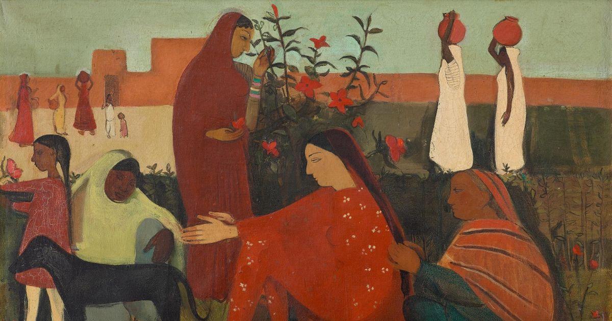 The work was painted at the artist's family estate in Gorakhpur and showcases a group of women engaged in myriad activities in a field.