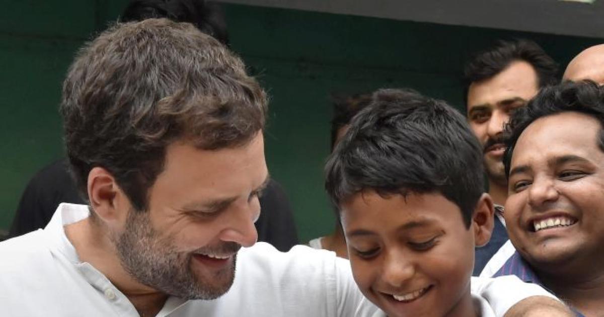 Image: Rahul Gandhi interacts with a boy during a meeting in Amethi. Photograph: Nand Kumar/PTI