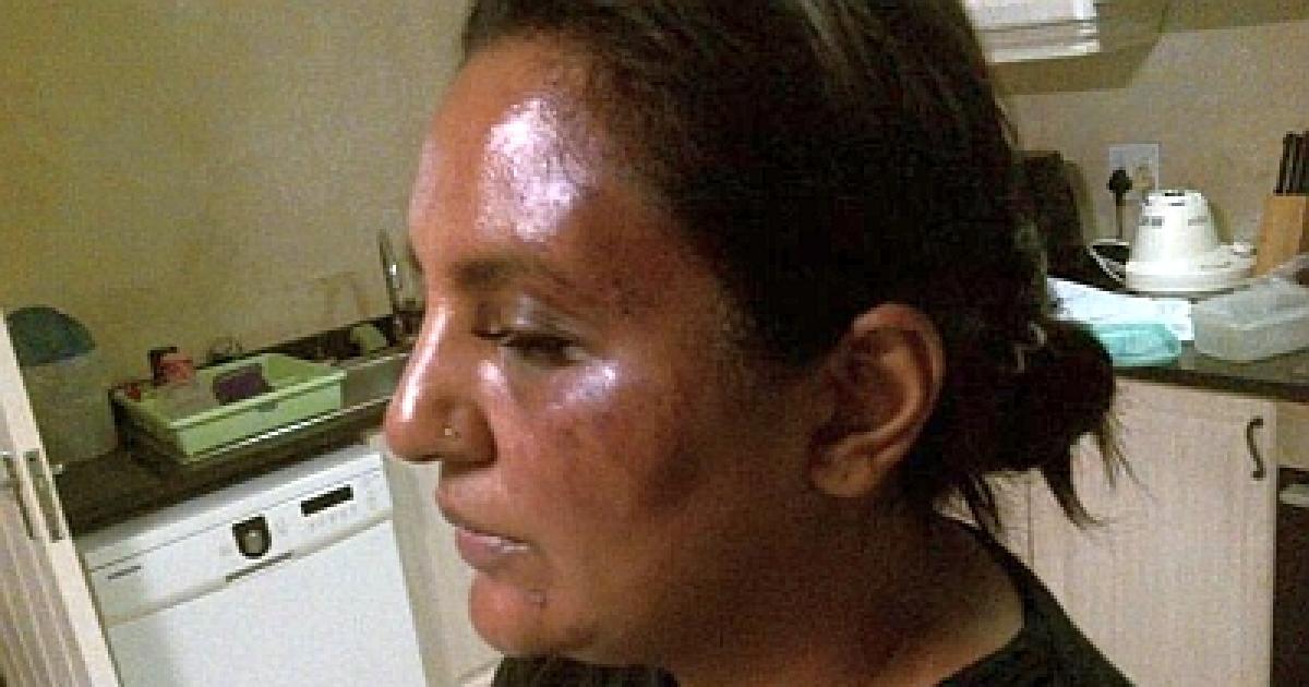 When she stopped her vehicle, two of the men came to the car, one allegedly putting a knife to her throat while the other struck her in the face with a brick while he verbally abused her.