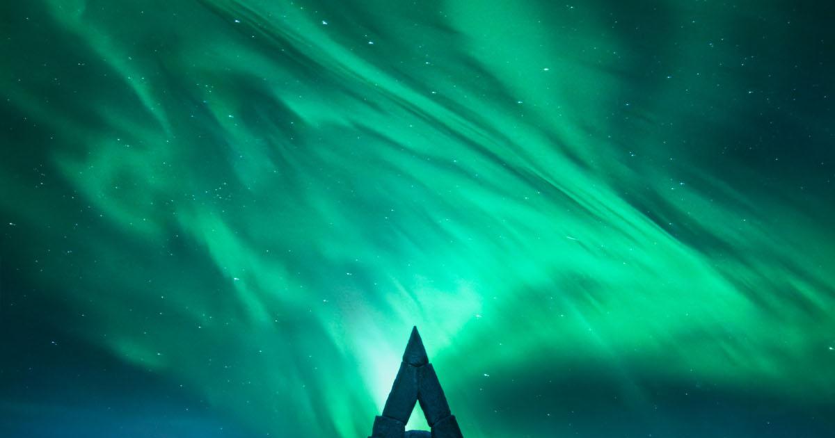 The Northern Lights over the mammoth sundial Arctic Henge, which is inspired by Norse mythology.