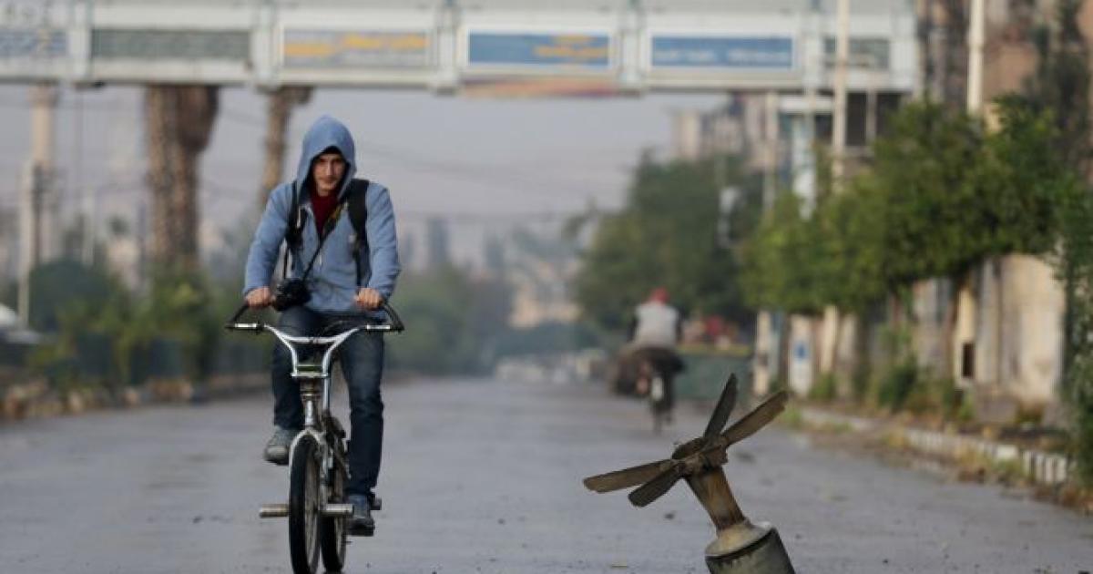 Image: A resident rides his bicycle near what activists said was an exploded cluster bomb shell in the town of Douma, eastern Ghouta in Damascus. Photograph: Bassam Khabieh/ Reuters