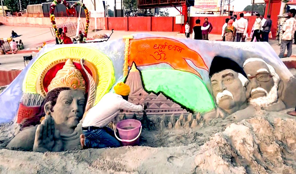 IMAGE: Sand artist Rupesh Singh creates an intricate sand sculpture of Lord Ram ahead of flag-hoisting atop the Shri Ram Janmabhoomi Mandir. Photograph: Video Grab/ANI Photo
