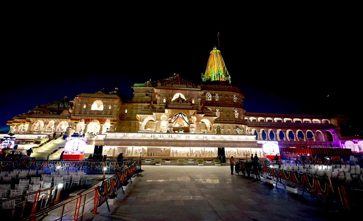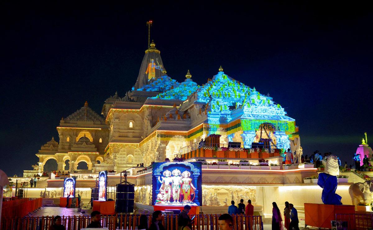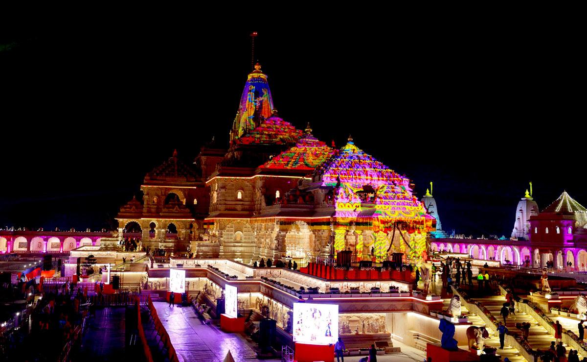 Glimpses of the Shri Ram Janmabhoomi Mandir, glowing in radiant light on the eve of the Dhwajarohan Utsav in Ayodhya, Monday, November 24, 2025.