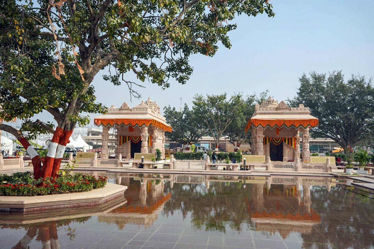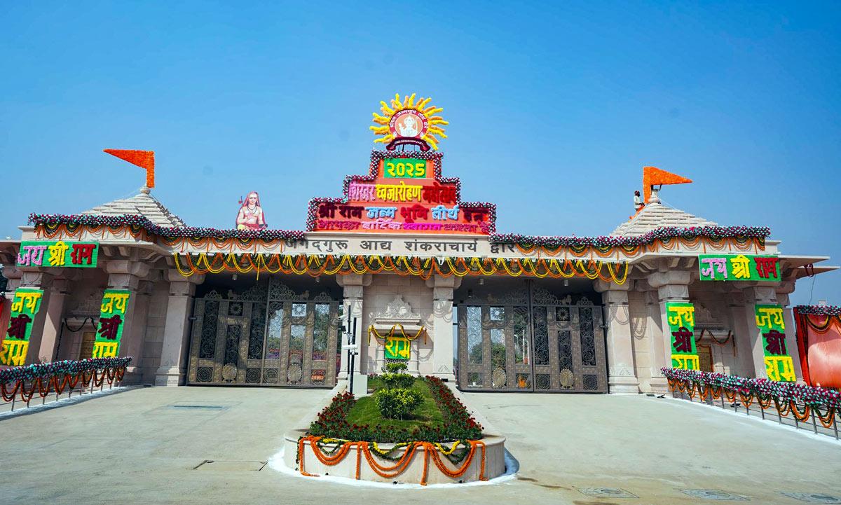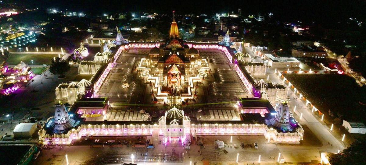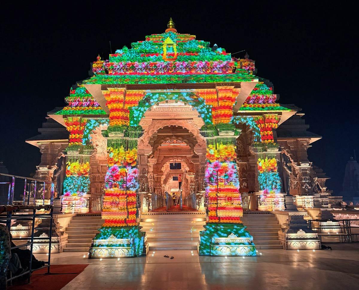 Glimpses of the Shri Ram Janmabhoomi Mandir, glowing in radiant light on the eve of the Dhwajarohan Utsav in Ayodhya, Monday, November 24, 2025.