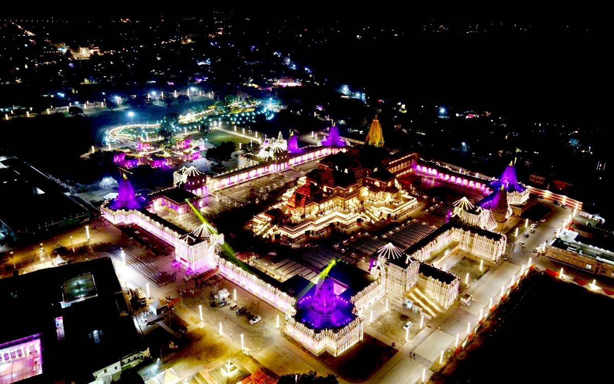 IMAGE: An aerial view of the illuminated Shri Ram Janmabhoomi Mandir, here and below. Photograph: @ShriRamTeerth X/ANI Photo