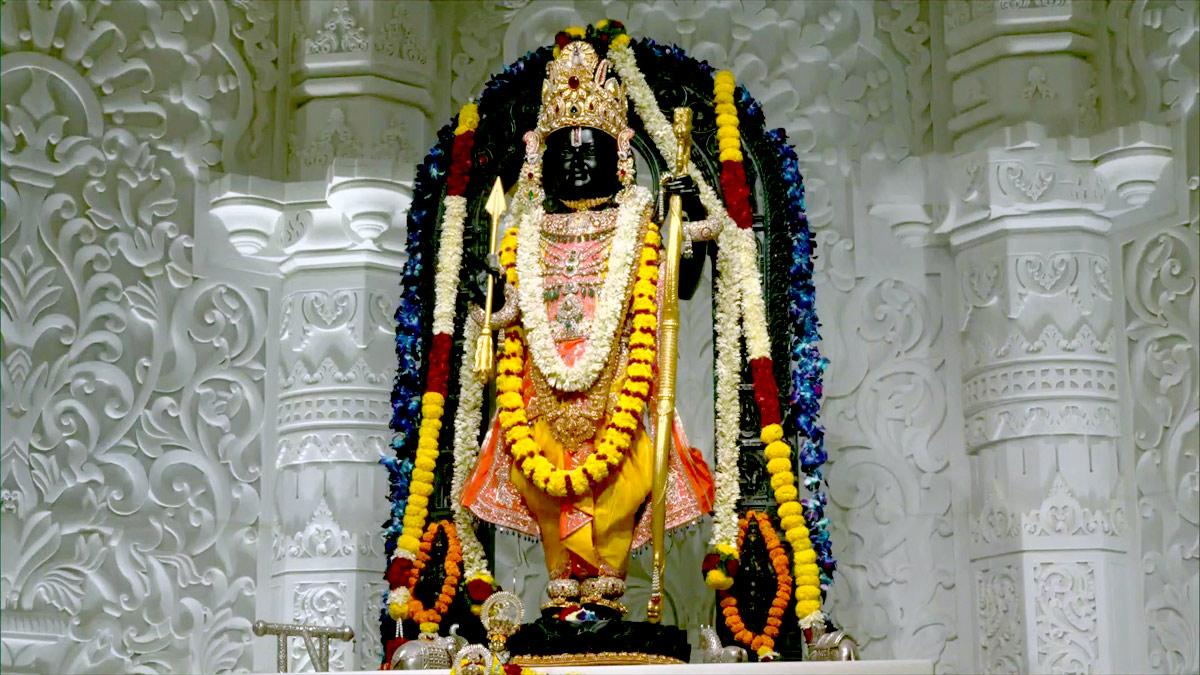 IMAGE: Ram Lalla at the Shri Ram Janmbhoomi Mandir in Ayodhya. Photograph: Kind courtesy Doordarshan