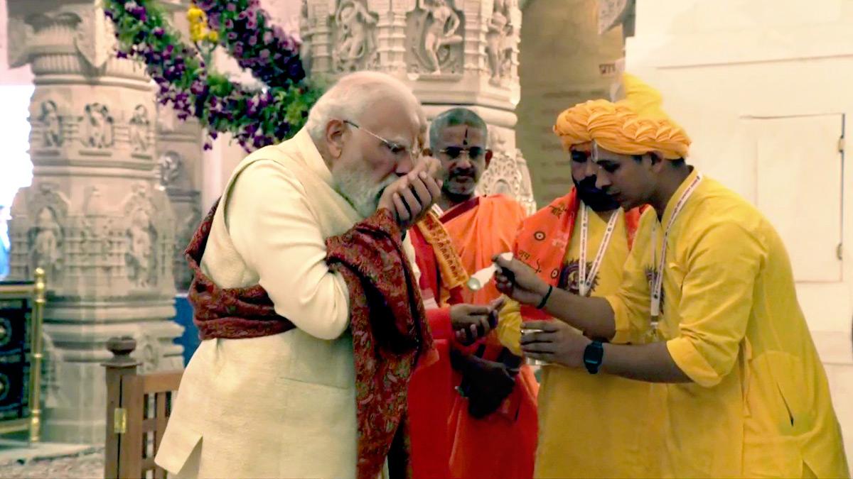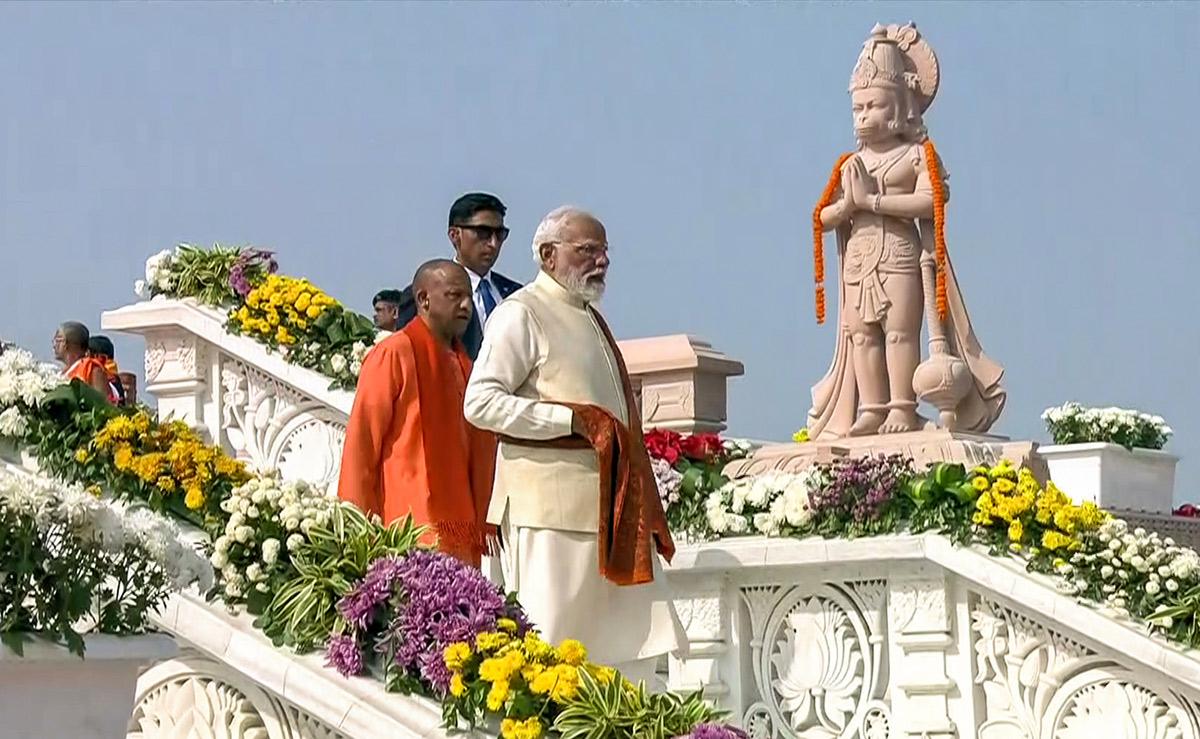 IMAGE: Modi descends the stairs of the Shri Ram Janmabhoomi Mandir. Photograph: Video Grab/ANI Photo